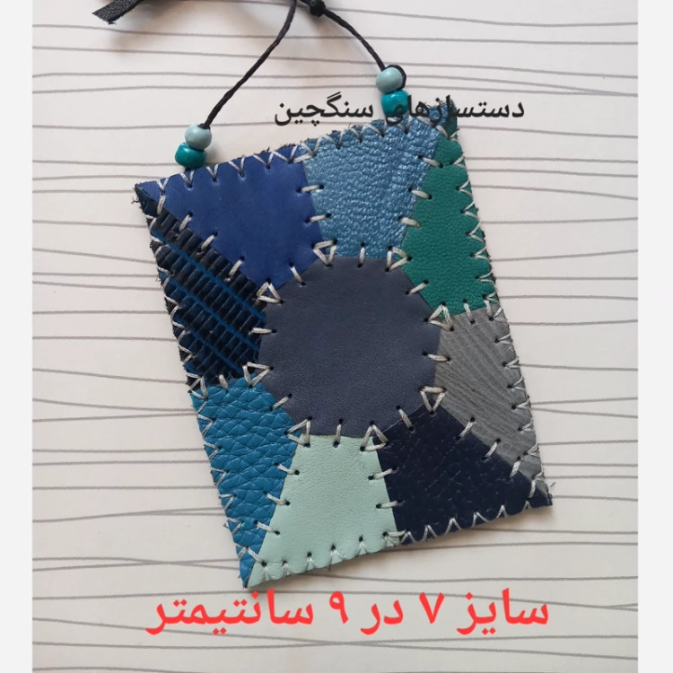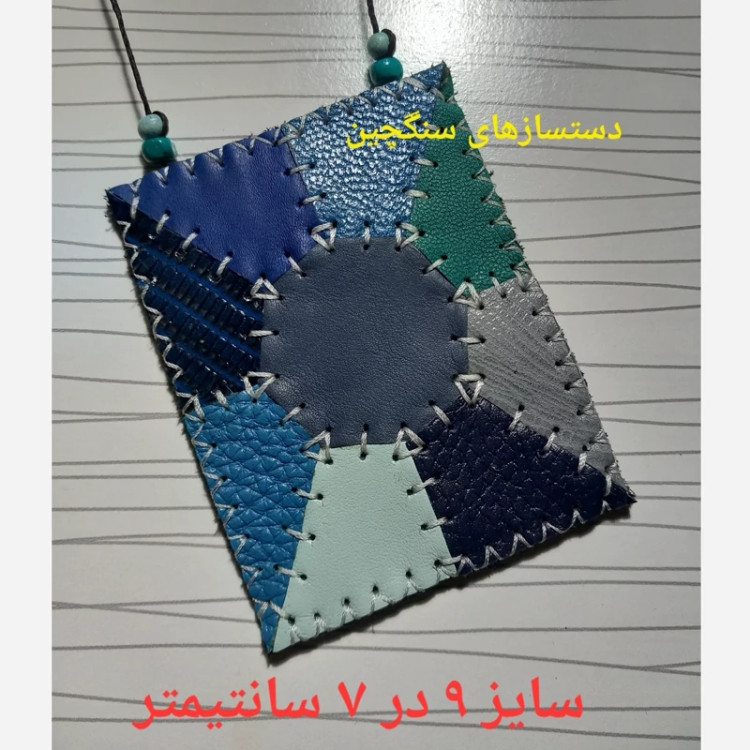 این محصول به درخواست خریدار محترم و با طراحی و رنگبندی ویژه آقایان آماده و به غرفه افزوده شده نقشهای جادعایی از ترکیب رنگهای مختلف چرم طبیعی گاو ایجاد شده . کاملا دوخت خورده و با گذر ایام و استفاده مداوم تکه ها از هم جدا نمیشوند. پشت کار شیاری برای گذاشتن دعا وجود دارد این کیف دعا به شکل مستطیل و ابعاد آن 9 در 7 سانتیمتر است برای زیبایی بیشتر از مهره رنگی چوبی در تزئین استفاده شده و بند هم از نخ ضخیم است.