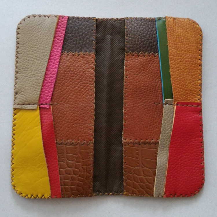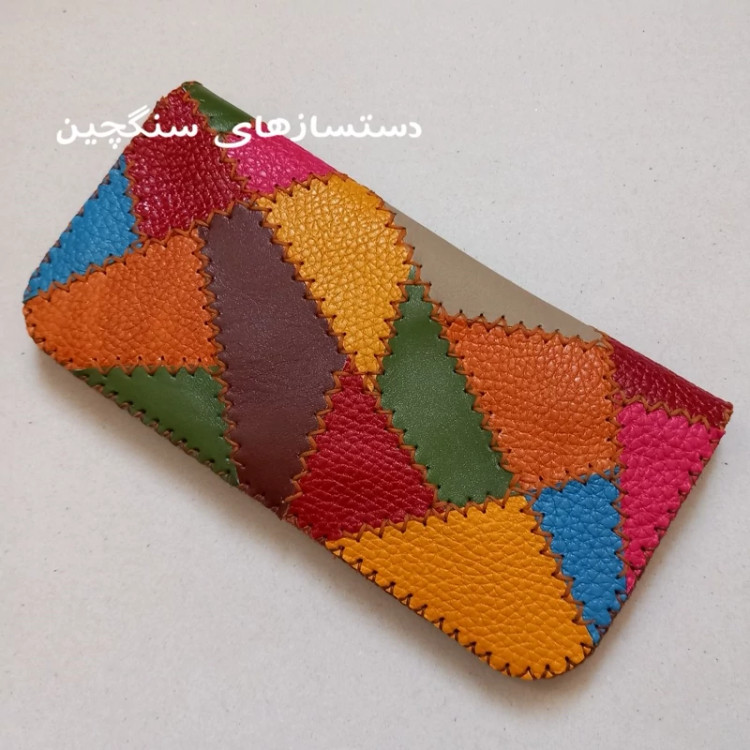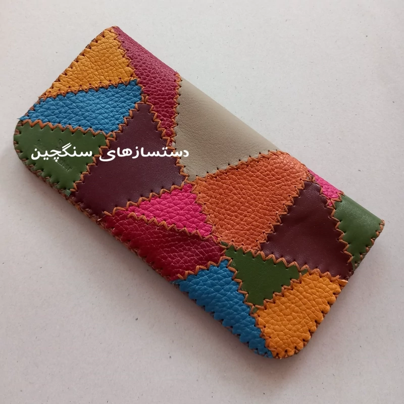 کیف پول چرم طبیعی گاو دست دوز رنگارنگ طرح خاص، جدید و ذوقی! تمامی نقش و نگار کیف از ترکیب و بهم دوختن چرمهای طبیعی رنگی ایجاد شده کیف چهل تکه و از چرم طبیعی گاو و بصورت کاملا دستی تهیه شده ترکیب رنگهای زرد ، زرشکی، سبز، فیروزه ای، عسلی ، کرم و قرمز ۲ جیب بزرگ برای اسکناس یا گوشی تا ۶ اینچ دارد ۸ جای کارت مجزا دارد با نخ موم زده و تمیز و بادقت دوخته شده برای مخفی ماندن دوختها، آستر سوزنی دارد مناسب هدیه و مناسب استفاده خانمها و دختران و علاقه مندان به صنایع دستی کیف تک دوز است و در صورت شارژ مجدد، احتمالا رنگها متفاوت خواهد بود