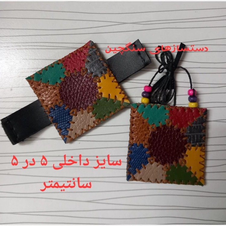 این محصول به سفارش مشتری و به صورت ست بازوبند و کیف گردنی تهیه شده پشت هر دو محصول یک شیار بدون دکمه یا زیپ برای قرار دادن حرز قرار دارد طراحی و اجرای محصول کاملا دستی است محصول از چرم طبیعی گاو و کاملا دست دوز است نقش و رنگ روی محصول از ترکیب قطعات رنگی چرم طبیعی بوجود آمده کاملا دوخت خورده و مرتب طراحی بازوبند به گونه ای است که در صورت دفورمه شدن کش بعد از مدتها استفاده، خریدار محترم براحتی میتواند کش را تعویض کند. رنگ تکه دوزیها تا حدودی توسط خریدار قابل انتخاب است. قابل طراحی از نظر رنگ بصورت مردانه و زنانه