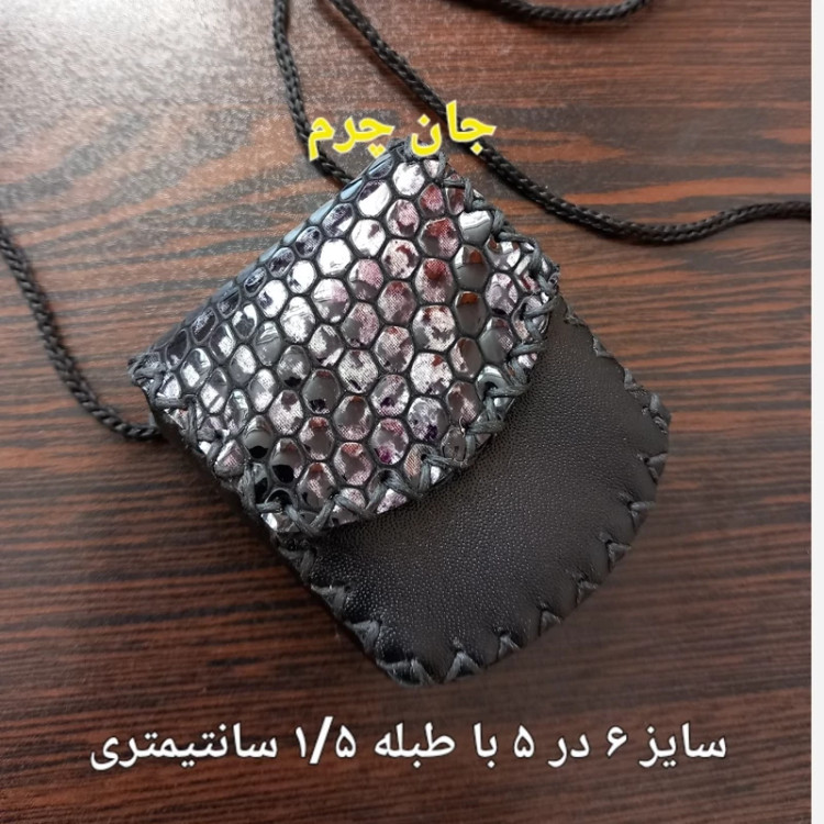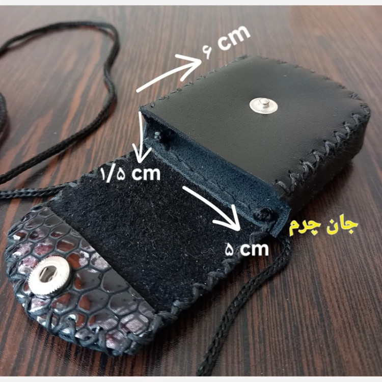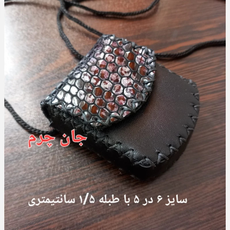 کیف گردنی دعا جنس چرم طبیعی گاو رنگ ترکیبی مشکی / پوست ماری براق طراحی به شکل کیف برای تدارک جای مناسب ویژه نگهداری ادعیه و آیات قرآن طول کیف از لبه تا وسط انحنای پایین، 6 سانتیمتر ، عرض 5 و طبله یک و نیم سانتیمتر است. بند بسیار محکم و مقاوم قابل سفارش در رنگ موجود در آگهی